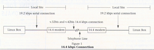 Before I describe a 56 kbps connection, let's review a connection with which you are probably more familiar: a regular 14.4 kbps modem connection. (See Figure 1 above.) A 14.4 kbps connection will require a serial port in each machine, a modem at each machine and, of course, a telephone line. The two modems communicate at 14.4 kbps using the v.32bis protocol. The serial connection between each modem and the Linux box can be set at 19.2, 38.4, or 57.8 kbps; data compression is the reason the serial connection runs faster than the modem. The modem connection is 14.4 kbps compressed with the v.42bis compression protocol; the serial connection is uncompressed. In order for the serial line to keep up with the modem connection, it must pass more bits per second than the modem. Now that you know where all the protocols fit into the picture in a 14.4 kbps connection, let's tackle a 56 kbps connection.