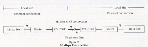 Take a look at Figure 2 (opposite). A 56 kbps connection may be too fast for your serial port, so Ethernet offers an alternative. Ethernet signals cannot be transferred over the telephone lines, so you must use a protocol specifically designed for telephone lines, v.35. What you end up with is Ethernet coming out of the Linux box, being converted to v.35 signals, and being transferred over the telephone lines to your Internet service provider. You need to install an Ethernet card in your Linux box and configure the kernel to support TCP/IP—see the NET-2-HOWTO document for the details. To convert Ethernet signals to v.35 signals you will need a router. Finally, to send the v.35 signals over the phone lines, you will need a 56 kbps CSU/DSU (also known as a digital modem).