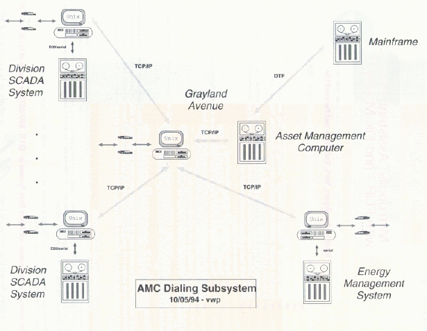 Gradually, the design of a new, distributed data gathering system took shape. We could install a PC in each of the division computer centers to receive the averaged analog data from the SCADA master computer and dial all of the field devices (meters, relays, etc.) in that division. A machine in our central office would receive a duplicate data feed from the division SCADA computers to provide data redundancy, and serve as a backup dialing system. All of these PC systems could be linked together over the corporate network with TCP/IP (except for Western division, where we could use UUCP). Vax connectivity was something of a problem, but we settled on a high-speed dedicated serial link with a simple file transfer protocol.