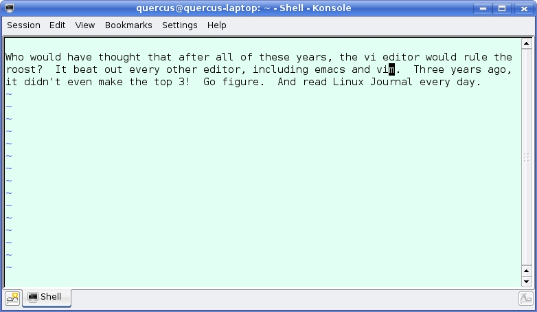 Who would have thought that after all these years, the vi editor would rule the roost? It beat out every other editor, including Emacs and vim. Three years ago, it didn't even make the top three! Go figure. It is interesting to note that Emacs, KWrite and Kate all scored about evenly, clustering around the 10% mark.