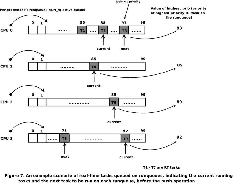 As discussed before, in order to ensure SWSRPS, when a low-priority real-time task gets preempted by a higher one or when a task is woken up on a runqueue that already has a higher-priority task running on it, the scheduler needs to search for a suitable target runqueue for the task. This operation of searching a runqueue and transferring one of its tasks to another runqueue is called pushing a task.