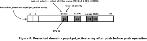 The pri_active bitmap tracks those priority levels that contain one or more CPUs. For example, if there is a CPU at priority 49, pri_active[49+2]=1 (real-time task priorities are mapped to 2–102 internally in order to account for priorities INVALID and IDLE), finding the first set bit of this array would yield the lowest priority that any of the CPUs in a given cpuset is in.