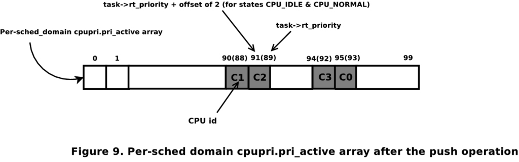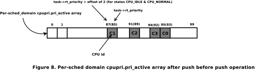 A push operation is initiated in cases 2 and 3 above. The push algorithm considers all the runqueues within its root domain (discussed later) to find the one that is of a lower priority than the task being pushed.