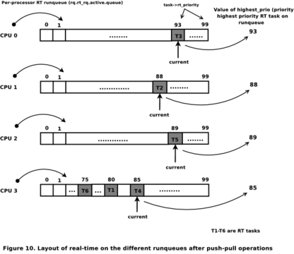 The real-time scheduler of the -rt patchset adopts an active push-pull strategy developed by Steven Rostedt and Gregory Haskins for balancing tasks across CPUs. The scheduler has to address several scenarios: