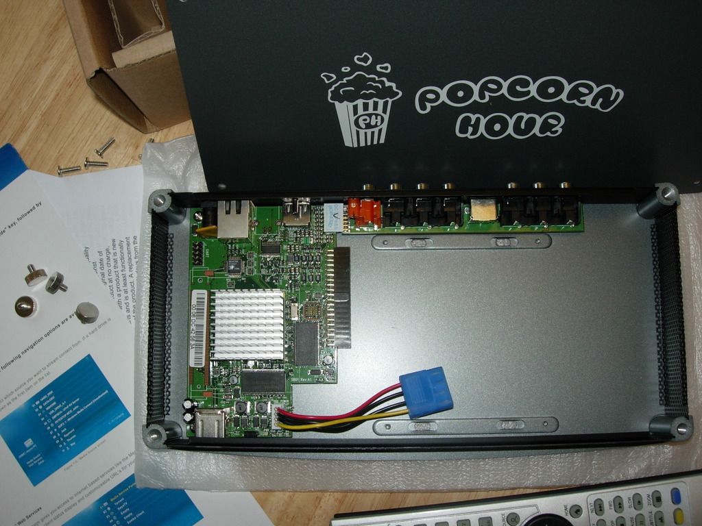 Installing a hard drive into the Popcorn Hour is essential if you want to use it as a file server or BitTorrent client. For those uses, there needs to be some sort of local storage. Installing a hard drive is as easy as sliding it in and screwing it to the bottom of the case. All of the necessary screws and cables are provided. One nice touch is that the top of the case is attached with thumbscrews, so accessing the interior is easy.