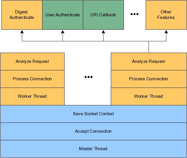 The Mongoose library is threaded and extremely simple to use. The initial context starts the master thread, which waits for incoming connections. New connections are queued, and worker threads are started to handle them. Processing of the connection occurs in the worker thread. Here, the connection request is analyzed to determine how processing will proceed. For performance sake, worker threads are started as needed and remain after a connection closes to process any additional queued incoming requests without the overhead of starting new threads (Figure 1).