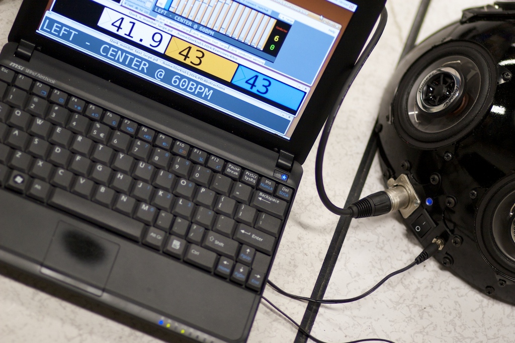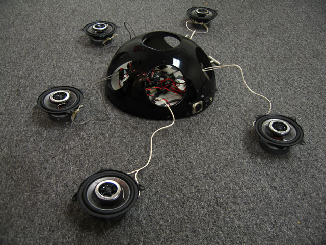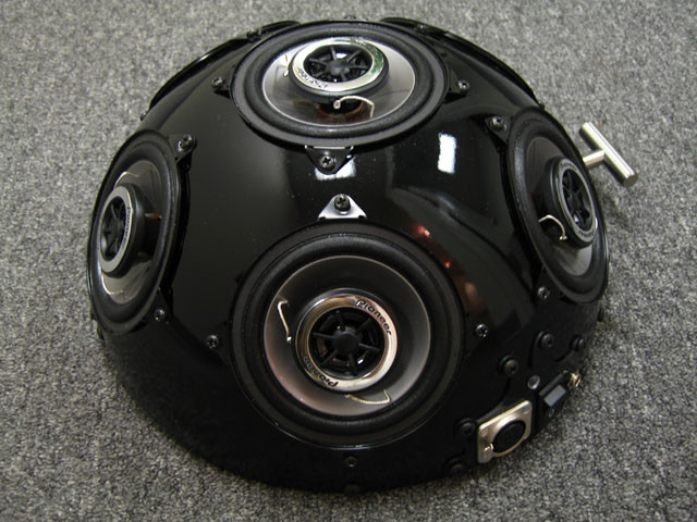 As you can see in Figure 3, the hemipods are definitely eye-catchers. An amplifier and six speakers are mounted within a hemisphere enclosure for a radiant 6-channel sound dispersal (Figure 4). Each seat in the group has its own pod, and each pod is controlled by its single user. The pods are potentially the most expensive component to the orchestra, but the L2Ork group has published complete directions for users who want to cut costs by building their own arrays.