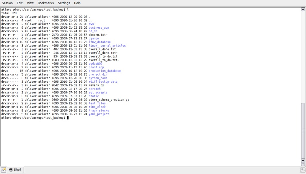 Finally, here are some general observations on the incremental nature of the backups. The amount of space saving is dependent on usage. rdiff-backup saves all information, so if you do a lot of deletes, the backup directory will fill up with the deleted files unless you prune regularly. As described earlier, the block nature of the file comparison is not efficient for small changes across multiple blocks. I bring this up as a prompt to have you monitor the disk space for your destination directory for a period of time until you have a sense of how your usage pattern affects it. On the whole though, I have found rdiff-backup provides a good compromise between backup size and backup versatility.