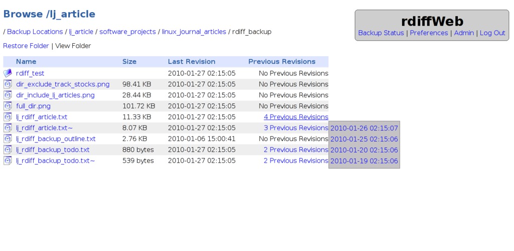The point is to find files. When you log in, a page will be presented with the backup directories for which you have permissions. You then can traverse the directory tree to get to the file or directory you want. Figure 5 shows four versions of this article available. Clicking on a timestamp opens the browser download dialog allowing you to download the file to your choice of location. If you want to download a directory, click on the Restore Folder link. You then will be taken to a page that lists the various available timestamped versions. Select the appropriate version, and the directory and its contents will be bundled up according to the Directory Restore Format specified on your User Preferences page.