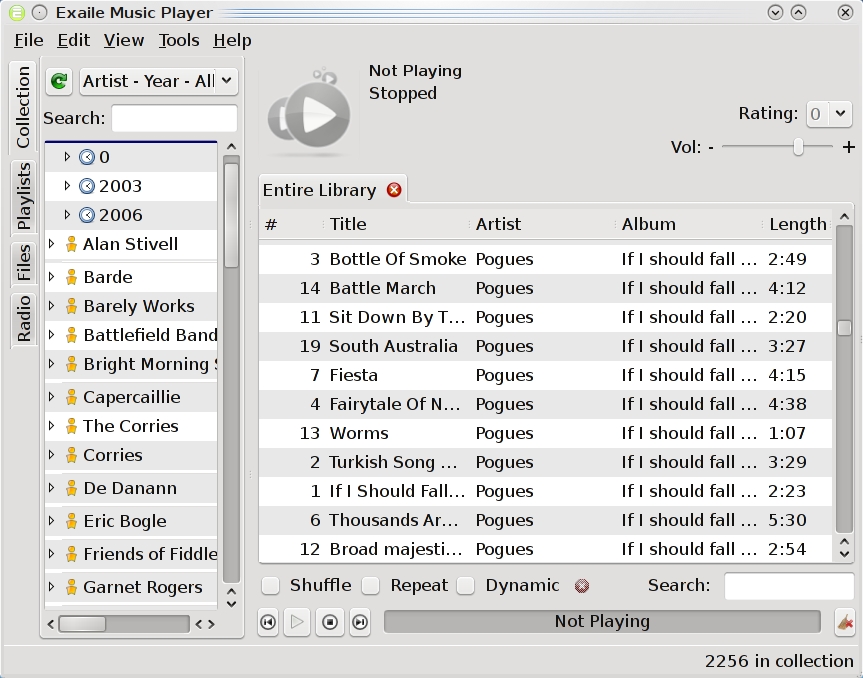 With Exaile, the other features start to get more interesting. Exaile includes a blacklist manager, so you can exclude tracks that you prefer not to hear but are not ready to delete, as well as commands within the context menu to burn selections to CD/DVD.