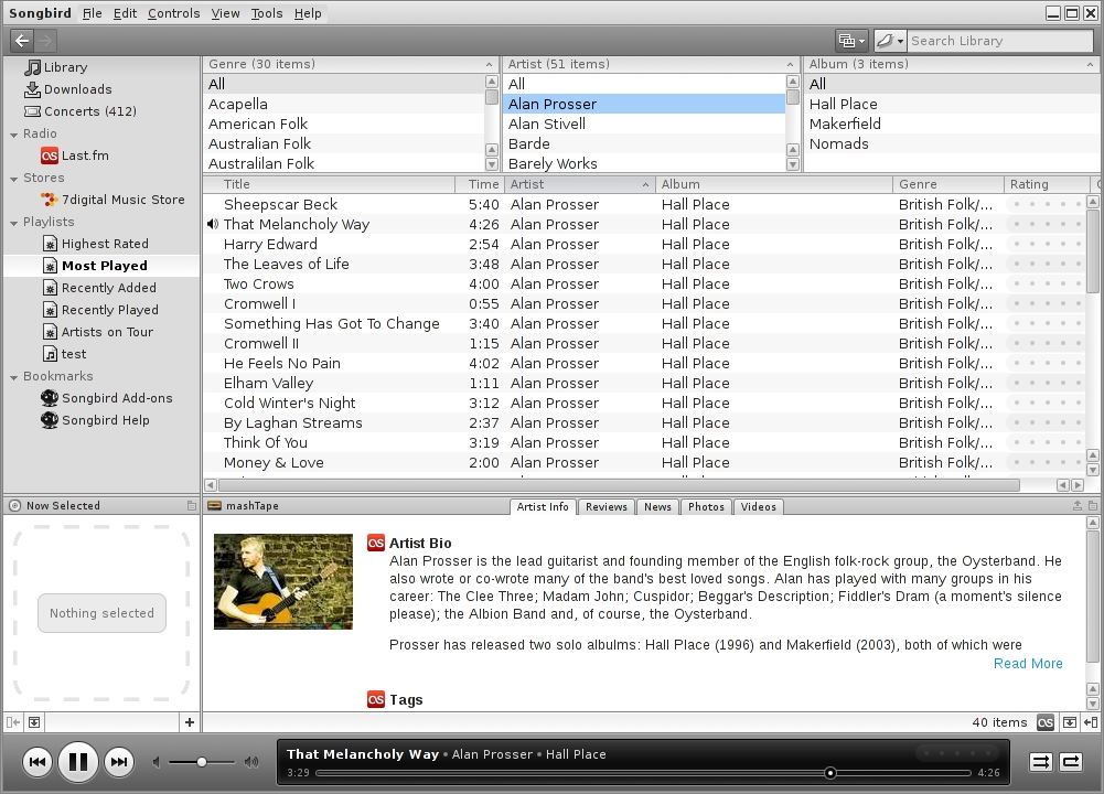 Instead, music players are starting to provide alternatives to liner notes using resources from the Internet. All five players can hunt the Internet for lyrics and covers, although with Rhythmbox, doing so requires enabling plugins. Exaile and Amarok also search for Artists and Albums, while Banshee bizarrely opts for a context pane that includes Top Albums and Top Tracks by the current artist—information that is minimally useful and more than a little imaginary the first few times you play tracks. However, taking a hard-core fan approach, Songbird outdoes the rest by searching for reviews, news, photos and videos.