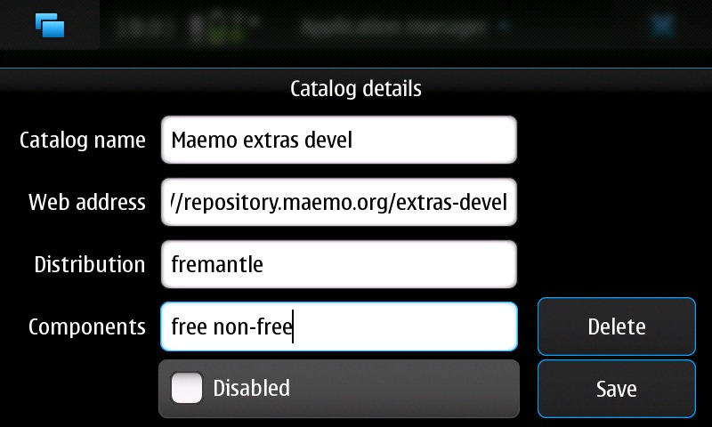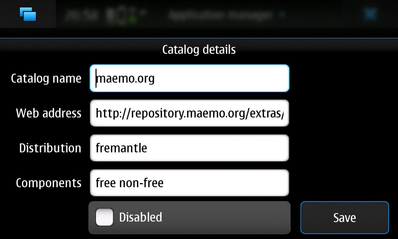 These are available from the Maemo Extras package repository. To enable it, launch the App Manager, click on the title bar to bring up the menu, and select Application catalogs. Select maemo.org (it might be called Maemo Extras on some phones), uncheck the Disabled check box, and tap the Save button (Figure 1).
