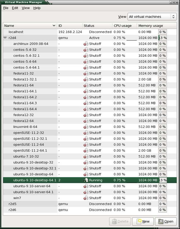 Figure 2. The virt-manager window shows hosts with VNC servers. Connecting to the localhost is automatic.
