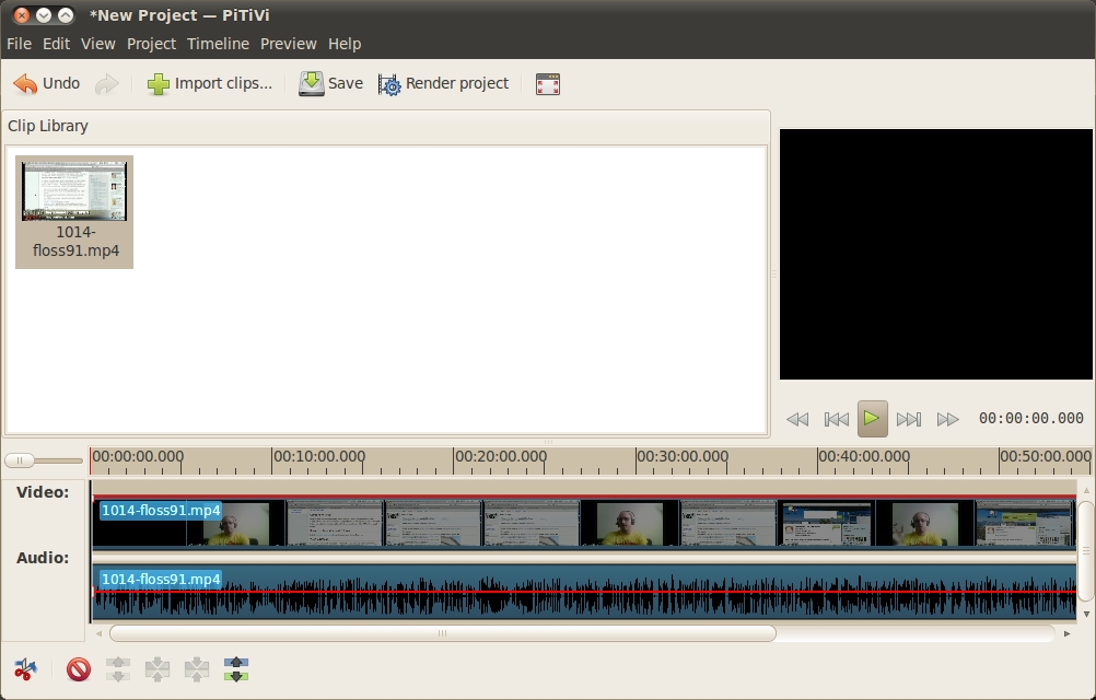 The source list is the main white area on the left part of the window. This is where you can import the different video clips, photos and sound files that will be used in your project. You can either drag the files onto this white area or click the Import clips... button to load them. Whichever approach you use, each clip will appear in the source list area ready for use in your project. Test this by either dragging a video onto the source list or importing it with the Import clips... button and selecting a video. If for some reason PiTiVi can't load your file (most likely due to it being an unsupported format), an error appears at the bottom of the source list.