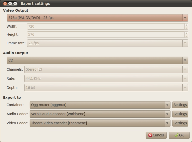 In this dialog box, set the visible size of the video in the Video Output section. There are a variety of defaults here, but you can select Custom if you want to specify your own size. In the Audio Output section, you can specify the audio quality of your video. Finally, in the Export to section, you can choose which codecs are used in your project. An important note here is that the Container file type can often contain a different type of codec. As an example, the .avi container can have many different types of video codecs inside.