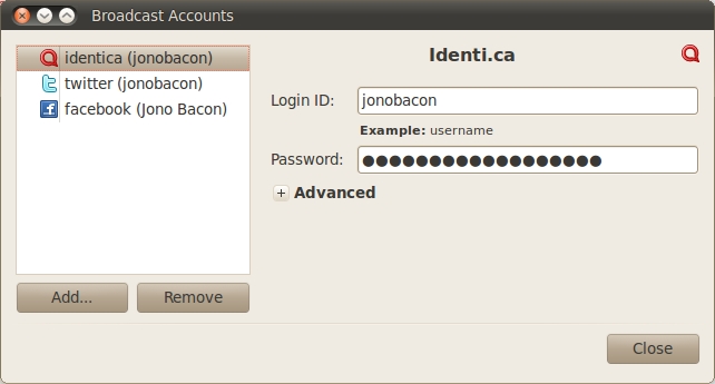 To use Gwibber, you first need to have an account on at least one social-networking service it supports. As an example, I have a Twitter feed at www.twitter.com/jonobacon, and I can use Gwibber to send and receive content without ever having to use the normal Twitter Web site. Gwibber's major benefit is that it brings all of these different social-networking services together into one window. Continuing my example, in addition to Twitter, I also have a Facebook page (www.facebook.com/jonobacon) and an identi.ca account (identi.ca/jonobacon). Ideally, not only do I want to read all of these feeds in one place, but also when I post a message, I want it to appear on all three at the same time. This is simple with Gwibber.