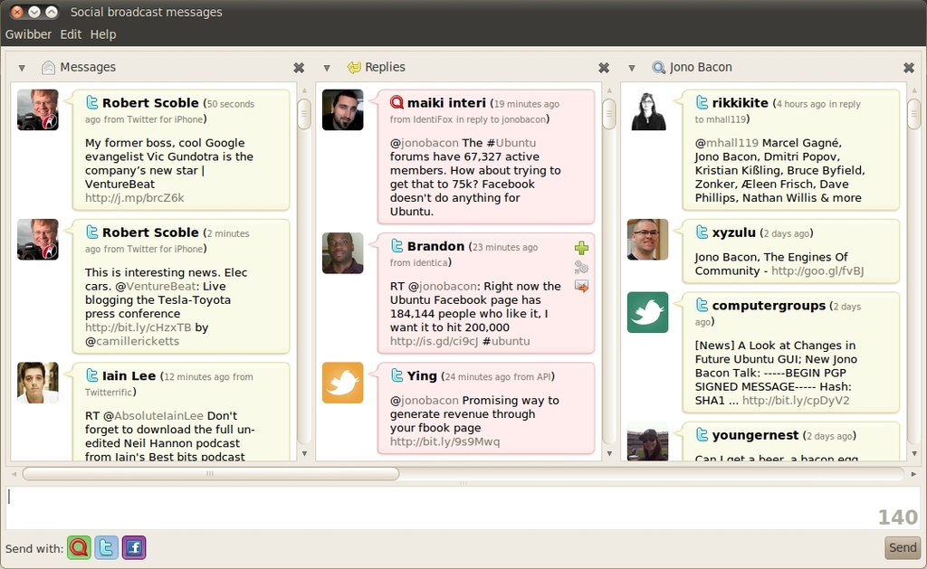Now, let's see your accounts in action. Click the messaging menu (the little envelope in the panel), and click Broadcast to load Gwibber. A window that looks similar to Figure 3 appears.