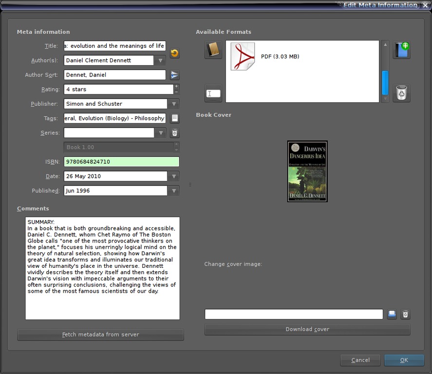 Moving along to the right is the metadata tool. This is the heart and soul of your database. The metadata are all your obvious tags: ISBN, Author, Series name, Publisher, Copyright date, Publication date for that edition and so on. It also includes the cover art, the listing of the different formats in which you have the book, a comments field and a tags field. Fetching metadata from the remote server populates the fields for you, not including the cover art, and it puts the back-of-book copy in the comments field and the genre in the tags field. Downloading the cover art pulls the cover art linked to that ISBN from the ISBN or Google Book servers. If you get art for an edition you didn't intend, you always can replace it by hand.