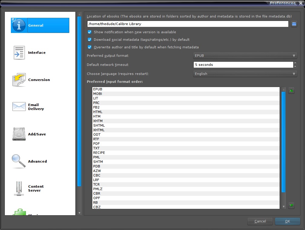 Finally, there's the Preferences button, which brings up the granddaddy of all dialogs (Figure 3). This is the beating heart of the operation, offering lower-level access to the database, debug functions, conversion defaults and a bunch of other stuff. Most interesting, perhaps, is the Calibre server setup, which allows Calibre to operate like a remote library system for other computers on your network (or on the Internet, if you often experience the sudden need for one of your e-books while at the office). Pretty much everything in here, sophisticated though it is, is self-explanatory.