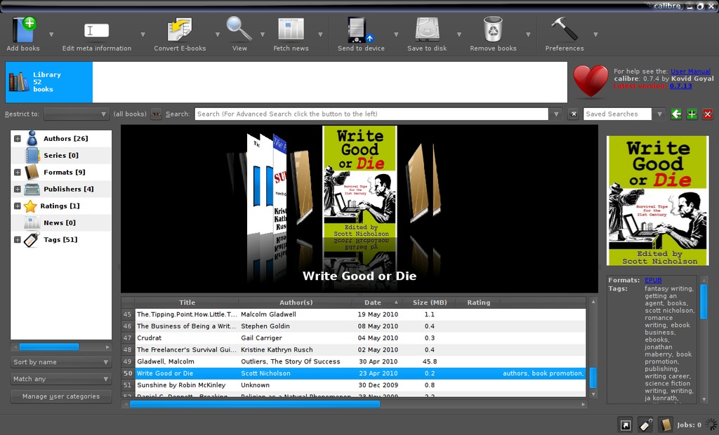 Moving down again, is the library itself. In the left pane, you'll find the available hierarchies—Authors, Publishers, Tags, formats and ratings. It offers all of these as pre-sorted searches, and clicking on them will modify the list you see in the center pane.