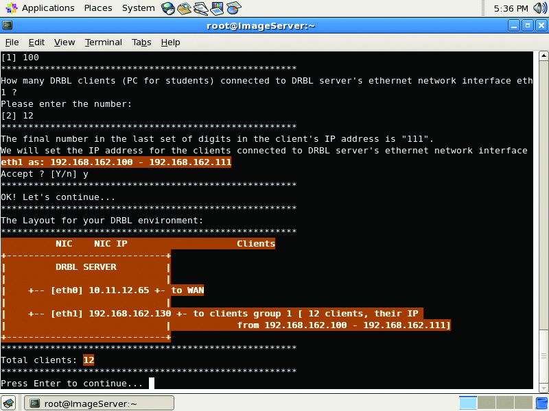 After entering the above command, you are presented with a series of prompts. For our purposes, you can accept all of the defaults, but make sure to read them to understand what is occurring during the DRBL installation. Because I used the i386 version of the CentOS distribution, I had to upgrade to the i686 version before DRBL would begin the installation. When this process is complete, enter the following command to configure the DRBL server: