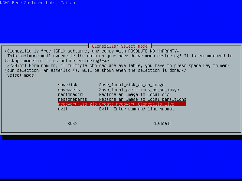For the second scenario, let's use the Live version of Clonezilla to create a recovery CD/DVD for a critical system. This is handy for near-line backups and/or off-site storage, but it also can double as a method for mass cloning systems if you lack the network infrastructure to use DRBL and PXE. If you are an OEM builder, you can use Clonezilla in this way to create recovery CDs for inclusion with your systems, like the big PC manufacturers have done for years. Recovery discs also can supplement change management processes—for example, if you have a server that requires high availability that is in need of major software upgrade. By capturing the server in its current state prior to the upgrade, you have a viable rollback plan should the upgrade go awry.