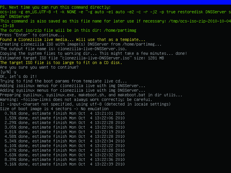 With your image captured, you now can build the recovery disc. Select the same options as above to start Clonezilla (device-image, local-dev, mount USB as /home/partimag), but then select Beginner Mode and “recovery-iso-zip Create_recovery_Clonezilla_Live” (Figure 6). Select the image that was just captured as the image to restore, and confirm that the destination device to be restored matches the mount label of the critical system (that is, sda, hda1). Leave the language and keymap options the defaults. Select .iso as the recovery file type. If prompted that the target .iso file is too large to fit on a CD, answer yes to create the file anyway. Clonezilla will start building the .iso file in the root of the USB drive and include the captured image in the .iso image (Figure 7). At the end of the process, power off the machine using the prompts. Burn the resulting .iso from the USB hard drive to a CD or DVD depending on the size.