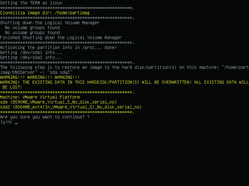 To test the recovery disc, boot from it and select the default option from the bootloader screen, which will default to “Clonezilla Live” with the name of your img file (Figure 8). The recovery disc then will bypass the usual Clonezilla selection screens, immediately launch the appropriate cloning program and ask for confirmation to overwrite your drive with the image on the disc (Figure 9). If all went well, you now have a good copy of your system to use in case of emergency.