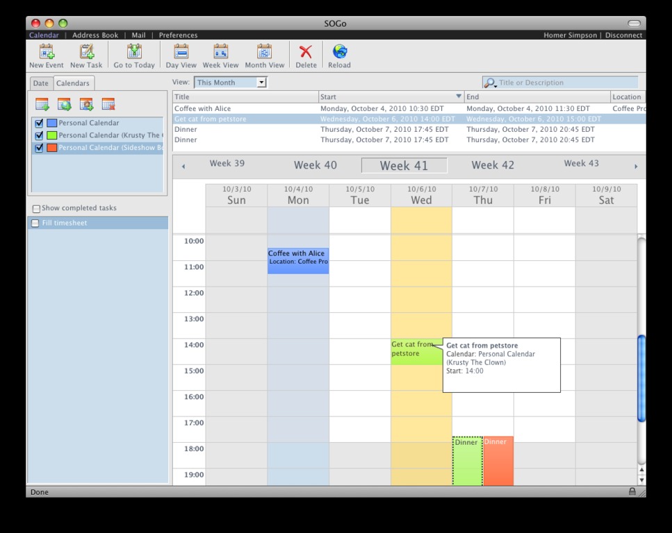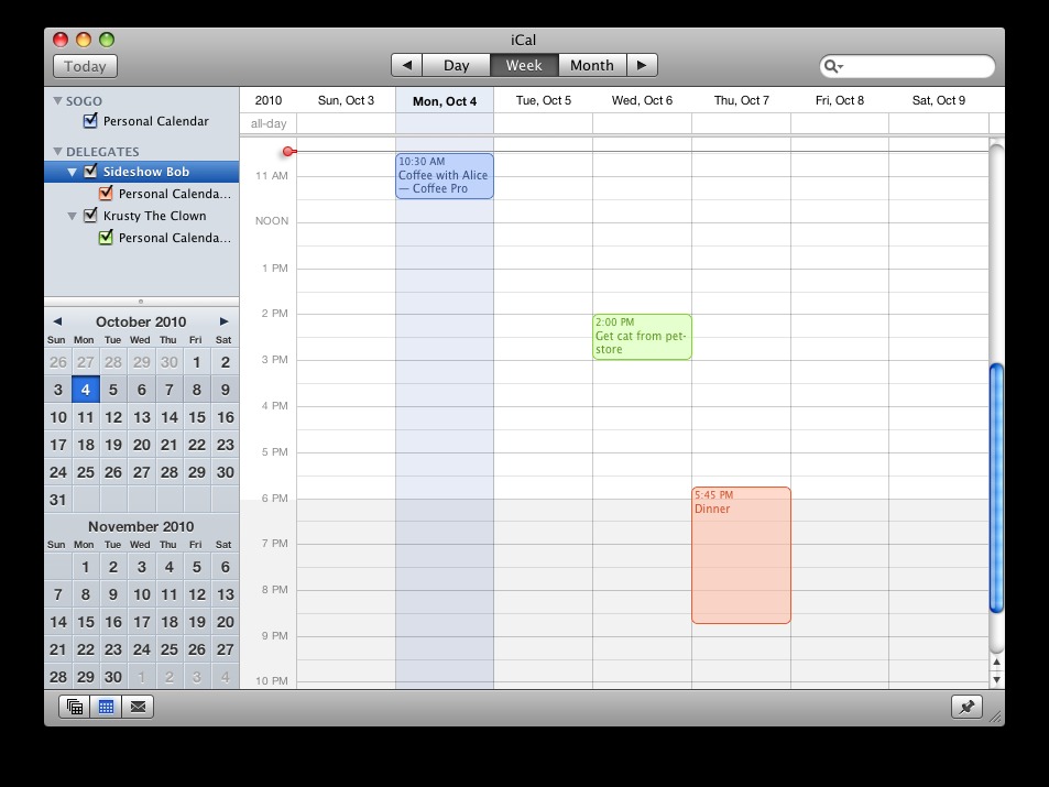 On Mac OS X, if you prefer Apple's closed-source applications, you easily can use Apple iCal 3 and iCal 4 with SOGo. All features will be available, including calendar sharing and delegation, due to SOGo's excellent compatibility with the CalDAV protocol and its implementation of some Apple-specific extensions. Since Mac OS X 10.6, it's also possible to use Address Book with SOGo through the CardDAV protocol in order to access your contacts. When you combine those two applications with Apple Mail, a cohesive environment is created with collaboration possibilities with other users on other platforms.