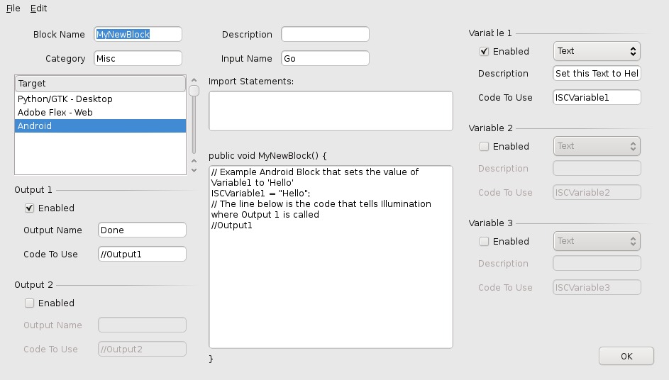 The right-hand section of the window describes up to three side effects that the block can have. Results of any calculations done in the code body can be sent to variables for use by the rest of the application. Which variables are modified is determined when you drag the resulting block onto the canvas and configure it. There doesn't seem to be any type of extensible API for modifying other variables.