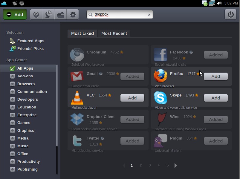 Jolicloud's application store allows you to install many applications with just a few mouse clicks. The Chromium Web browser is installed by default, but you can install Firefox if that is your preference. For serious office work, Jolicloud offers Google Docs as well as the OpenOffice.org suite. Various communications tools also are available, including Pidgin and Skype. Even fun tools like Boxee and Celestia are easily installed.