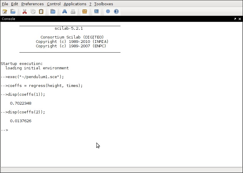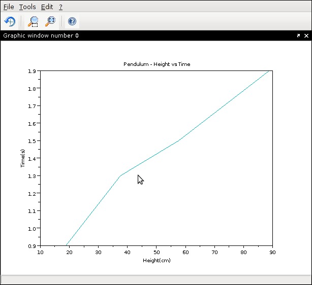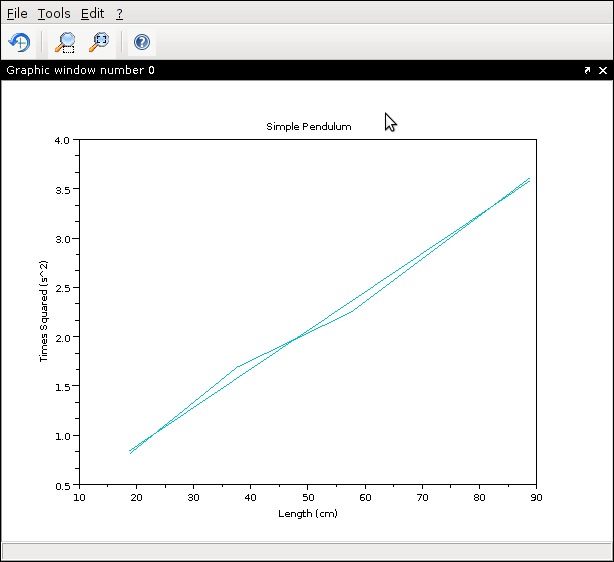 This looks like Figure 5. It seems like a reasonably close match, considering that the spread of measured pendulum lengths covers only 70cm. If you made measurements with pendulum lengths over a larger range of values, you likely will see an even closer match to theory. But, as an easy example experiment to show a small list of Scilab functions, you've already seen that simple pendulums seem to follow theory reasonably well.
