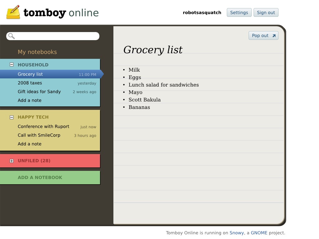 Canonical has quite a cloud service going with Ubuntu One. It syncs files, music, preferences, contacts and many more things. But, it's only partially free, and the server is completely private and proprietary. The philosophy of keeping the server bits completely closed turns off many of us in the Open Source community. Yes, Canonical has every right to develop Ubuntu One as it sees fit, but as users, we also have the right to look elsewhere. Enter Snowy. No, it's not an all-encompassing replacement for Ubuntu One, but Snowy is designed as a free (in both senses) syncing solution for Tomboy Notes.