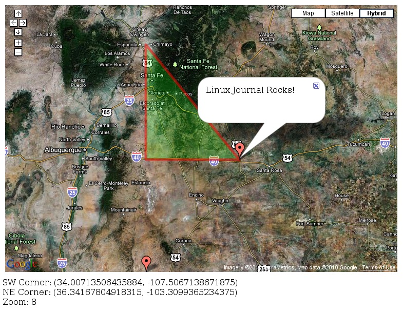 Here, you see two containers and a list of lat/long points that define their boundaries. So, with what you have so far, and some slightly different data, you get a map that resembles Figure 1. By default, the map centers on a location just outside of Albuquerque, New Mexico. You see a red triangle that's filled in with green. The triangle is semi-transparent, so you can see the map through it. You also see one of the markers in the lower-right corner of the triangle. In Figure 1, I've clicked on the marker to demonstrate the information window, which I discuss a bit more later.