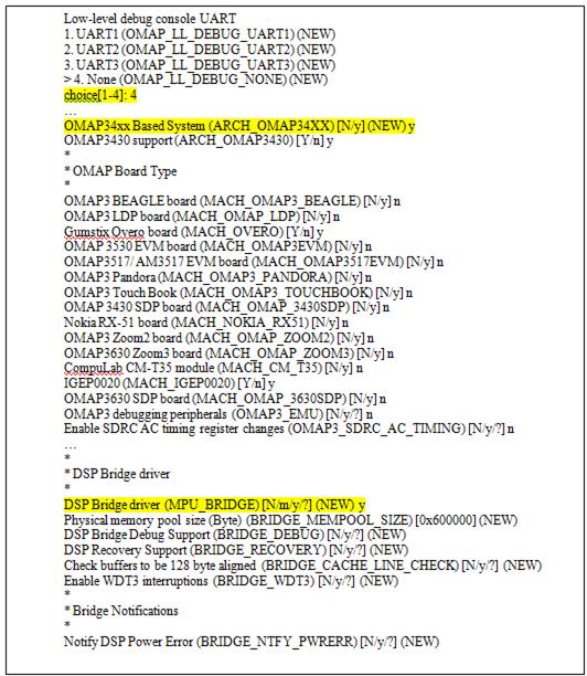 Next, issue the make oldconfig command, which is used to update the current .config file with new options. Generally, the default responses to the questions are acceptable, except in the highlighted cases shown in Figure 1.