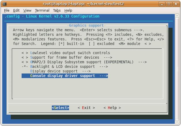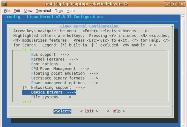 Note that the ellipses in Figure 1 are used to indicate breaks in the output for display purposes. Now, issue the make menuconfig command, which will launch a configuration interface in the terminal, such as the one shown in Figure 2.