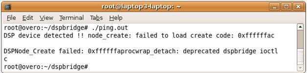 Once the new kernel has completed the boot sequence, add a password to the root user and secure copy the contents of the target/ directory of the userspace DSPBridge directories to the Gumstix. (The directories should be dspbridge/ and lib/.) Next, recursively copy the contents of the lib/ directory to the root /lib/ directory of the Gumstix and reboot the Gumstix. After the Gumstix reboots, enter the dspbridge/ directory and issue the ./ping.out command to receive the error shown in Figure 5.