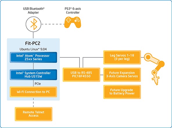 MB: Originally, I had purchased the computer before any cooperation with Intel. At the time of searching for an embedded solution, I was looking into Gumstix boards and Via processor-based boards. These were great for kinematics integration, but for heavy computation of vision, I needed something even more powerful. Fortunately at the time, CompuLab had just released its fit-PC2, which is the ideal computer for robotics. Once I posted the video, a couple days later, Stewart from Intel wrote a comment on my YouTube video regarding interest in the hexapod. I contacted him, and after a month or so, he said that Intel would want me to create two hexapods, one for tradeshows and the other for me, but the Intel folks can borrow mine if they have multiple demonstrations at the same time.