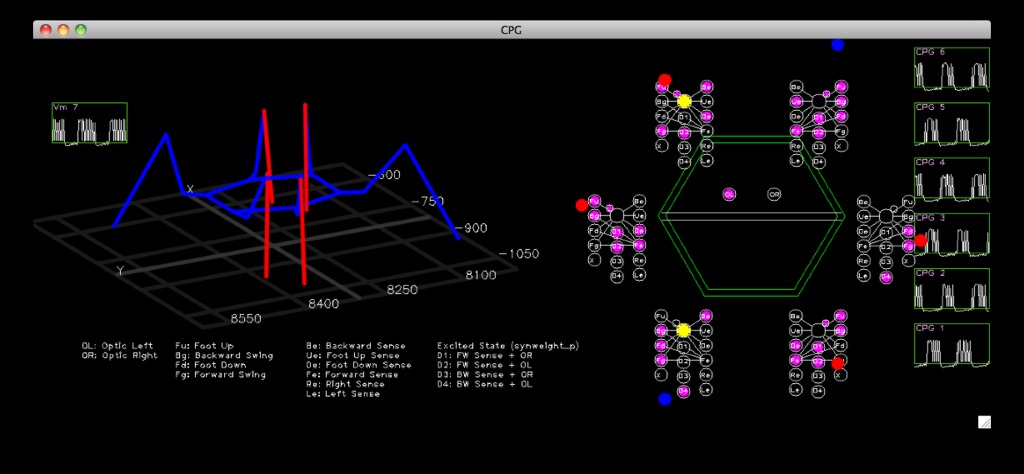 The NN is very much different. I based a good portion of the network on Randall Beer's work on a neural-network-based hexapod. The neurons I used were different, more biologically influenced. I believe that Beer used continuous neurons, which were differentiable, but the ones I used were integrated and fired with adaptation. They don't truly mimic biology, but they are much closer than continuous-based neurons. I constructed something similar to Beer's network, but I have to add additional neurons to move the legs around. The network is based around an oscillator called a Central Pattern Generator (CPG), also called a Pacemaker Neuron. These are created by mutually inhibiting two neurons. One begins to fire, preventing the other from firing, but slows down due to adaptation, and eventually the other neuron will begin to fire, inhibiting the first one, and so on. These CPGs are used to drive other neurons that operate the legs.