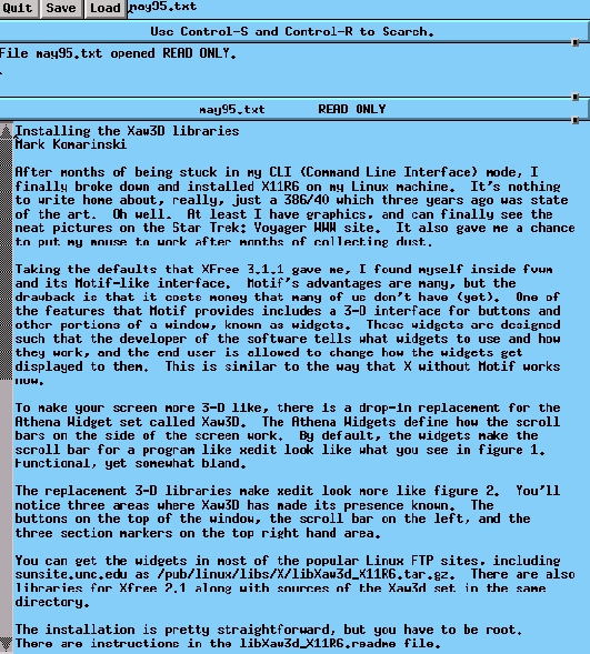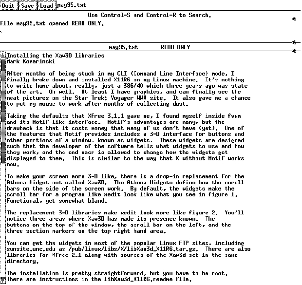 The replacement 3-D libraries make xedit look more like Figure 2. You'll notice three areas where Xaw3D has made its presence known. The buttons on the top of the window, the scroll bar on the left, and the three section markers on the top right-hand area.