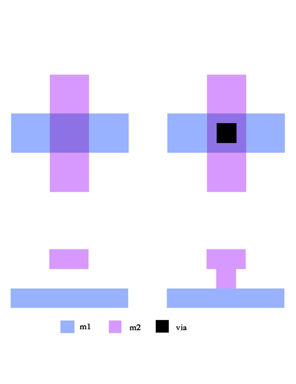 Each step in the fabrication process uses a different mask. Suppose we have a chip with two layers of metal wiring. We'll call the layer closest to the silicon base “m1” and the layer closest to the top “m2”. Because m1 and m2 are different layers, m2 wires can cross over m1 wires without making electrical contact. This is like a high road using an overpass to cross a low road. The left side of Figure 1 illustrates, in both an aerial and cross-sectional view, a vertical m2 wire overlapping a horizontal m1 wire. Note that the two are electrically separate. Suppose now that we want to create a point where a signal can cross from m1 to m2. To build this structure, we need a mask for m1, a mask for m2, and a mask for vias. A via is a hole in the insulating layer, which separates m1 from m2 and allows m2 to flow downward and contact m1, forming an electrical connection. This is shown on the right side of Figure 1; the black square is the via, which connects the two layers. Transistors are more complicated, requiring more masks and different materials.