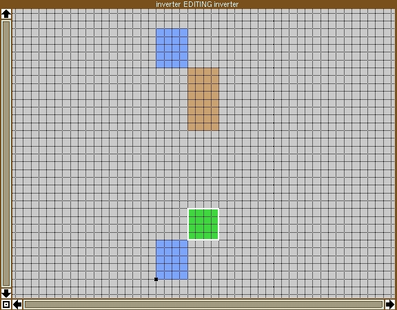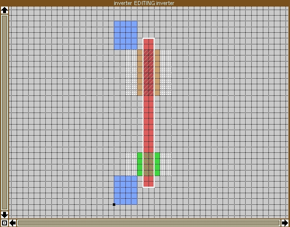 The transistors need poly running over the diffusion. In an inverter, the two polys for the transistors are connected together. This is the inverter's input—the signal driving the inverter is connected to the poly. It's simplest, then, to draw a single piece of poly which crosses both diffusions. Place the box at ll=(5,3) and ur=(7,29) and type: