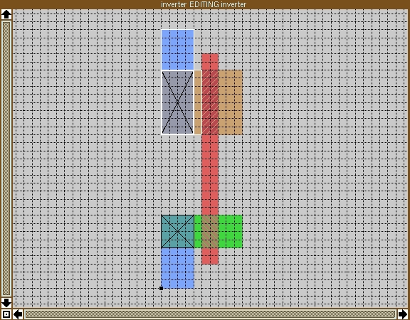 There are a couple of important points to notice. First, the area where the poly crosses the diffusion has a diagonally-striped pattern different from both poly and diffusion. This area represents the actual transistor, since FETs are constructed wherever poly passes over diffusion. To see this, place the cursor over the top transistor, and select it by pressing the s key. Now enter :what, which displays the names of the selected paint. Here, the selected area is “ptransistor”; Magic actually changes the paint from pdiffusion to ptransistor when poly crosses over it. The same concept applies when poly crosses over n-diffusion to form an “ntransistor”.