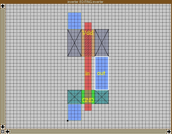 Creating the CIF file is simple; type :cif write inverter. This creates the file inverter.cif, which we'd send to MOSIS. This process is referred to as “tapeout”, a term coined before the advent of FTP when IC designs were stored on magnetic tape. If this were a real design, you would now take to your bed to make up for the fact that you hadn't slept in the last three weeks.