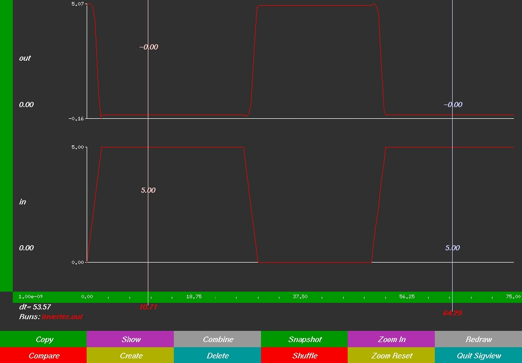 It might seem curious to use an analog circuit simulator for a digital circuit. We think of digital circuits as being in one of two states, 0 or 1, while analog circuits can take any of a continuous range of values. What's important to realize is that a digital circuit is actually a special kind of analog circuit. At the circuit level, a signal is either a voltage or current, and these are really analog quantities. The conventional 0 and 1 representations of a bit are simply abstractions of two particular voltage values; the actual values depend on the process in which the chip is fabricated. With CMOS in particular, you can generally ignore the currents and deal only with the voltages, due to the FET's mode of operation. For example, in the particular process for which we extracted our inverter, a 1 corresponds to 5 Volts (5V). In other processes, it might correspond to 3.3V or 2.5V. Happily enough, a 0 generally means 0V. As we all know, digital circuits don't switch instantaneously between their two values. It takes time to change voltages, and this delay is one of the things that makes your CPU run at 100MHz instead of 133MHz.