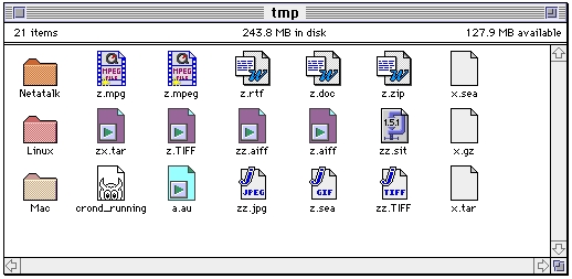Also, note that the file /usr/local/atalk/etc/AppleVolumes.system contains a list of file extensions. This list is not necessary, but the extensions provide a means for displaying the appropriate icons on the Macintosh desktop. For example, in Figure 1 you can see that the files z.mpg, z.rtf and zz.jpg are displayed with the correct Macintosh application icon.