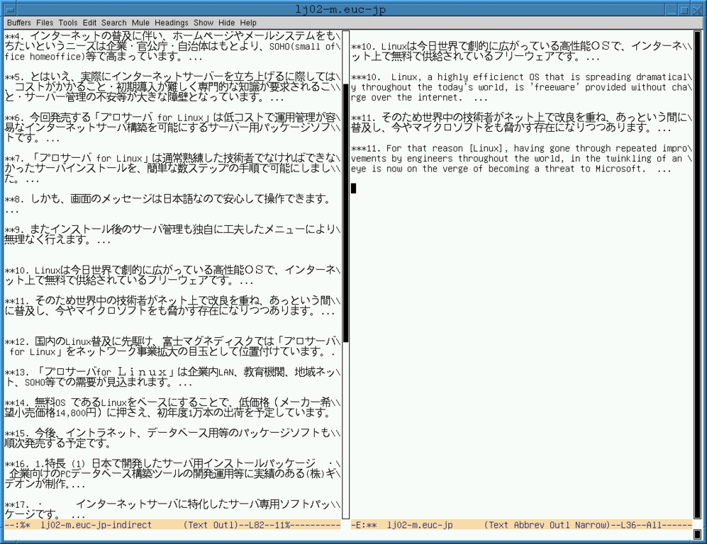 In Figure 3, what you see is reduced to just the Japanese source text and the English target text, i.e., level 2 and level 3 outline “heading lines”. In Figure 4, what you see is expanded to include snips from on-line dictionaries, notes and comments, i.e., outline “body lines”. But the accessible portion produced by narrowing is the same in both cases. For Figures 3 and 4, I used outline mode to keep source text, translation, abbrevs, glossary entries, notes and commentary all in one file. The left buffer shows only level 2 outline header lines, i.e., the Japanese source text, whereas the right buffer in Figure 3 shows this plus the target text and Figure 4 shows all three: source, target and notes.