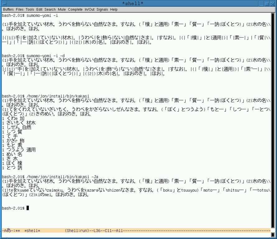 Finally, for JE work, Emacs is not alone. As planets circle the sun, I surround Emacs with several programs that help me figure out the Japanese or Chinese source text or that aid in delivering it in a form demanded by a client. My assistants include the following:
