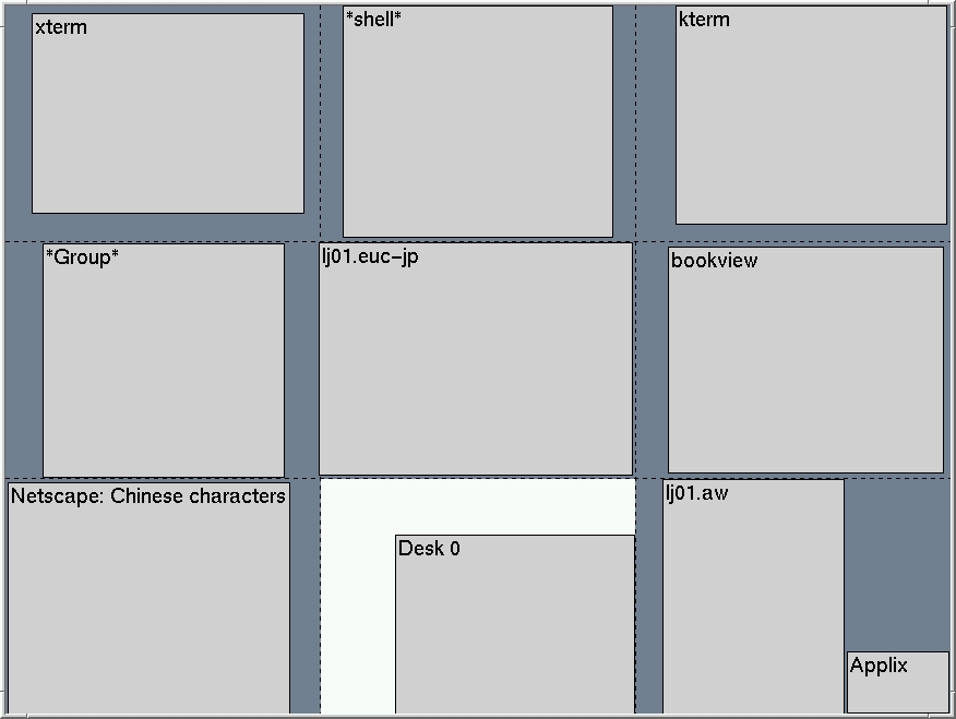 Whatever your arrangement, to be productive it must be consistent and persistent, i.e., for a certain task (like CE or JE translation) you must be able to recreate the same arrangement quickly. I have an init.hook file configured so that these applications all start up when I start fvwm2. By renaming it, I can immediately set up a different desktop for a different task. (See Figure 8 for one possible layout of a translator's desktop.)