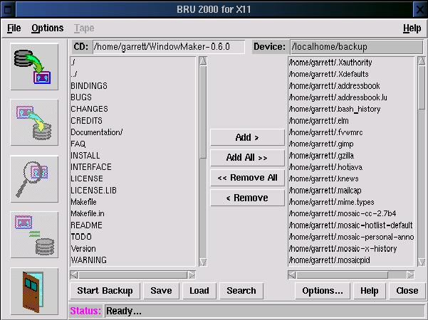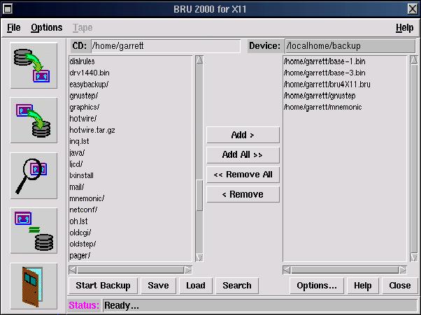 xbru is an interface to the original, command-line BRU backup software. BRU is a very flexible and powerful backup program. It is much more reliable than tar and friends, supporting CRC error detection and automatic verification after backup to ensure that you don't have a bad tape. You can schedule backups to run automatically and even change the tapes in an auto-loading tape drive for multi-tape backups. BRU backs up all types of files: device files, sparse files, pipes, soft and hard links, etc. The list of features is too long for me to cover here. For a full review of BRU, see “BRU—Backup & Restore Utility”, Linux Journal, March 1995, Issue 11.